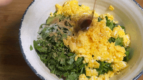 5、 将芹菜叶菜团蒸12分钟即可,金黄的色泽,馅料颜色鲜美