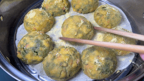 16. 将裹好玉米面的蔬菜团放入蒸锅中,盖上盖子大火烧开,转中小火蒸12分钟