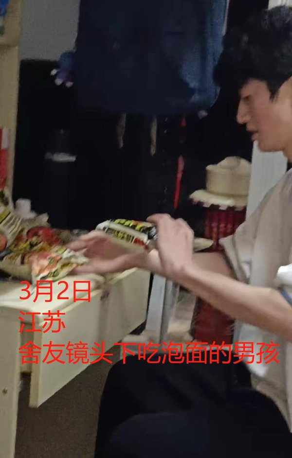 无独有偶,也是在3月2日的江苏,一位男子吃泡面被舍友记录的场面,第一次谈恋爱,生活费上交给女友,自己回到宿舍天天吃泡面。