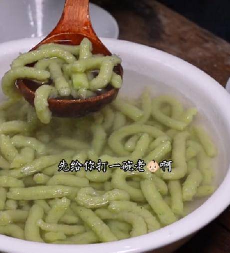 压出来的粉,一条长的都没有,全是一小截的,还非常粗,黑绿黑绿的,看着就不好吃的样子,但是老小孩却说非常好吃。