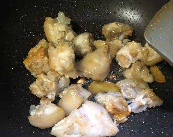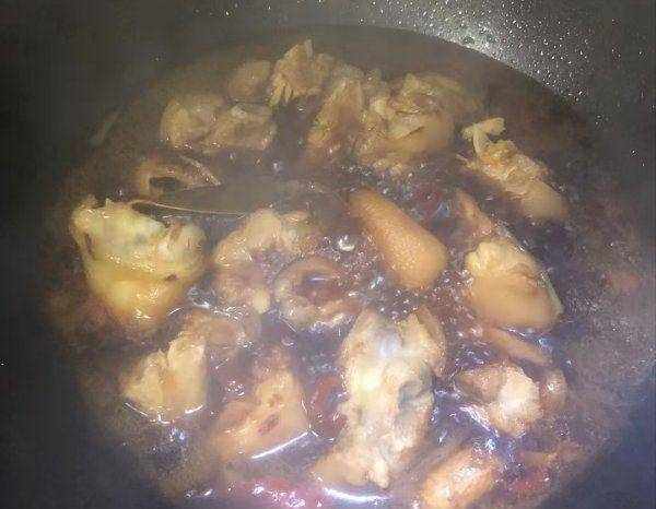 猪蹄上好糖色之后,放入生抽、老抽、料酒、翻炒均匀,然后往锅里加水,要没过猪蹄,大火煮开之后转小火慢炖30分钟。