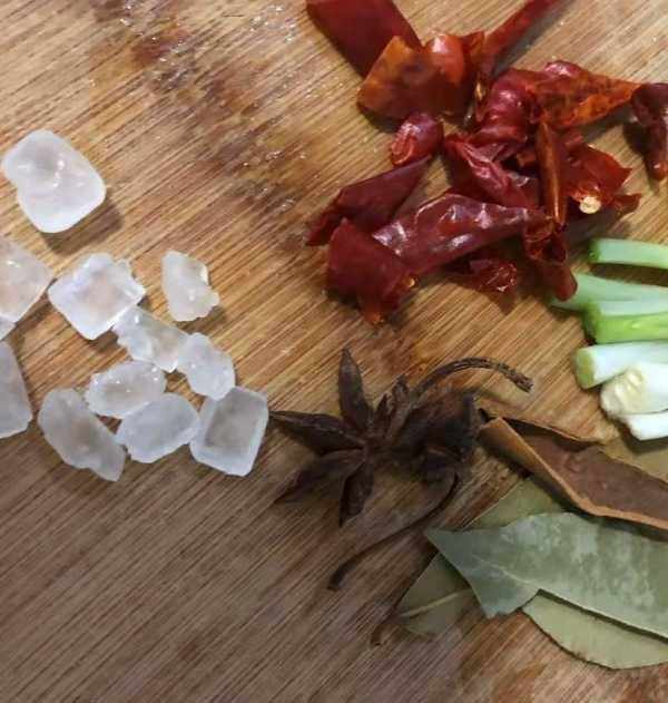 准备炖猪蹄所用的调味品,干辣椒切段、大葱切段、姜切片,然后其他要使用的也准备好。
