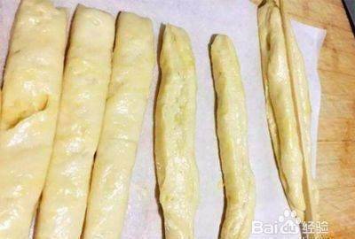 2.等到面团变大,膨胀里面充满气孔的时候,就可以制作油条了,面团不必要在楼在赶,直接把它铺开,用刀切成三厘米宽的条状,