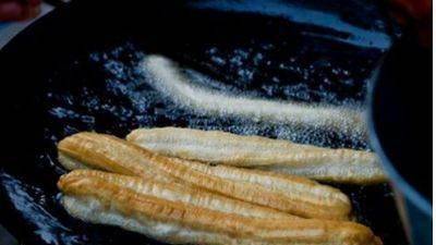 6,炸好的油条,要铺开,不要叠加在一起,容易变软,老百姓也喜欢用筷子把油条串成一串,这样拿回家能够保持油条的酥脆度,炸好的油条趁热吃才香脆可口,