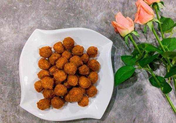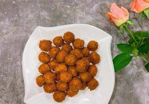 第四步,锅中放油,用大火将油烧到5成热,然后关小火,将丸子挤压成圆形后,放入锅中慢炸;最后再以大火复炸,直至粒粒色泽金黄,捞出沥油处理即可。