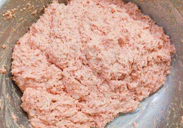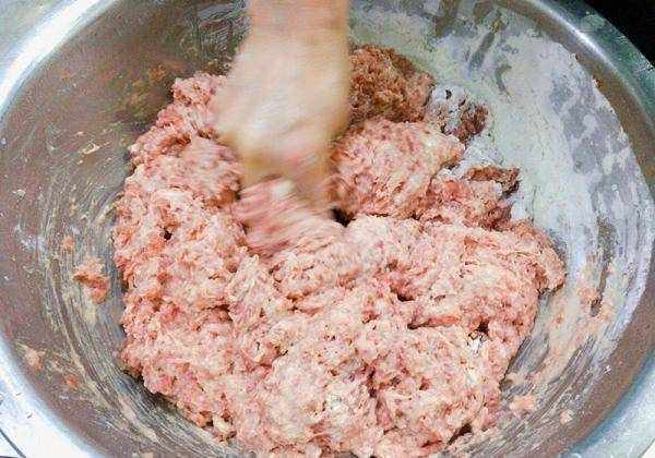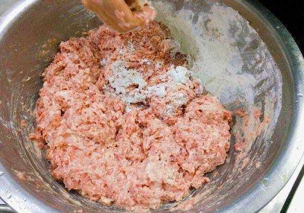 2. 面粉的比例越少越好,正常情况下3斤肉馅,添加的面粉400克左右即可;添加面粉时不要一次性全部倒入,分2次添加,第一次添加2/3,通过手感判断,如果觉得面粉不够,再添加剩下部分;