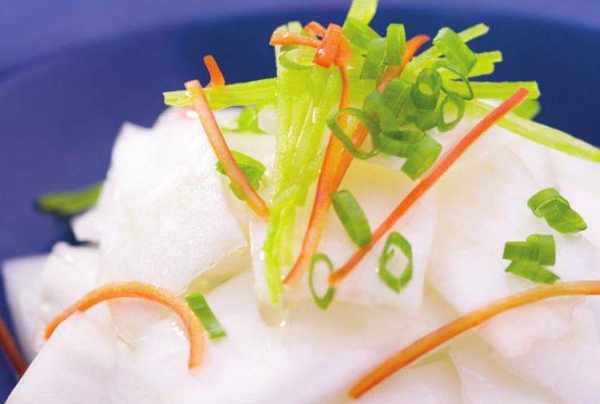 制作步骤:1 、嫩白菜帮洗净,晾干,用斜刀法片成4厘米见方的块;青椒、红椒洗净,分别去蒂及籽,切成丝,同白菜块一起放入泡菜汁中浸泡入味。