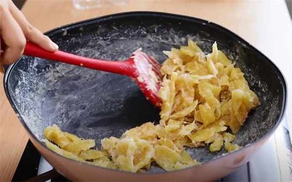 7.水分蒸发掉之后,它会起很多白色的泡沫,而且锅边也有反沙的现象,这时候我们就关火。