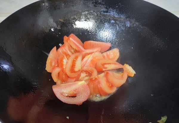 3.锅中倒入油,将蒜苗放入油锅中炒一下。我们再把西红柿倒入里面,西红柿下锅后可以用铲子多翻动,勤翻炒;