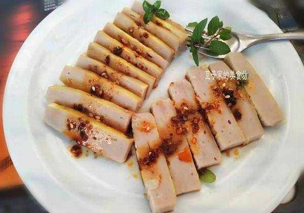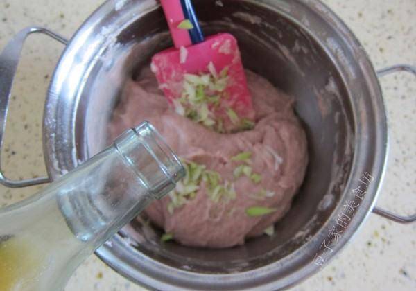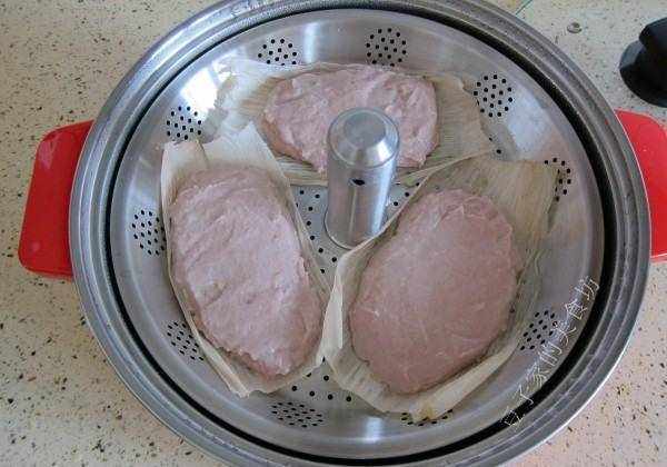 加料酒葱花混合一下,鱼蓉黏稠一些,不要太稀了就可以了。电锅里先放水,然后铺上玉米叶子放粘连,如果没有玉米叶子,可以放屉布不沾不漏就行。了。把鱼蓉平摊在玉米叶子上,刚刚好就做三块。
