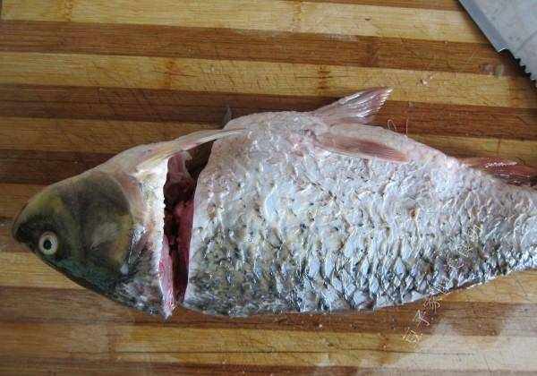 新鲜的鲤鱼收拾干净切掉鱼头,抽出鱼线。从鱼的背部切开,用刀把骨头剔除了。
