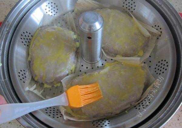 蒸8分钟左右,开盖刷鸡蛋液,最好刷二次蛋液。然后盖锅继续蒸5分钟。