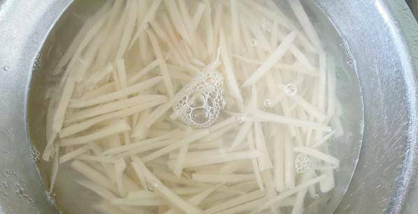 3、把切好的藕丝,放入清水里清洗两次洗干净藕丝上的淀粉,这样炒出来更脆嫩。