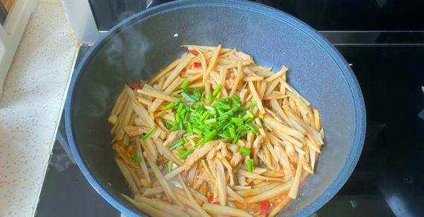 9、把切段的蒜苗放入锅里,快速翻拌均匀。