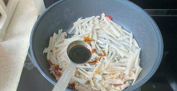 8、把沥干水的藕丝倒入锅里,加入白糖、老抽、生抽、盐,快速翻炒拌匀后关火。