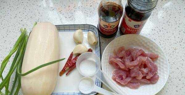 【食材】:莲藕1节,猪肉条120克,蒜苗4根,大蒜3粒,红辣椒3个,白糖3克,食盐少许,老抽半勺,生抽1勺,植物油适量