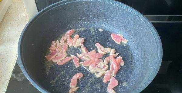 6、炒锅放入适量植物油,烧热后放入猪肉条,快速翻炒变色。
