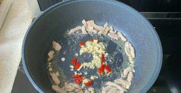 7、用锅铲把猪肉铲到四周,把蒜末和辣椒段放入锅里,爆炒出香味。