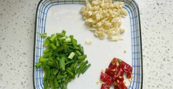 4、配料大蒜切成蒜末,辣椒切成小段,蒜苗小段,装盘备用。