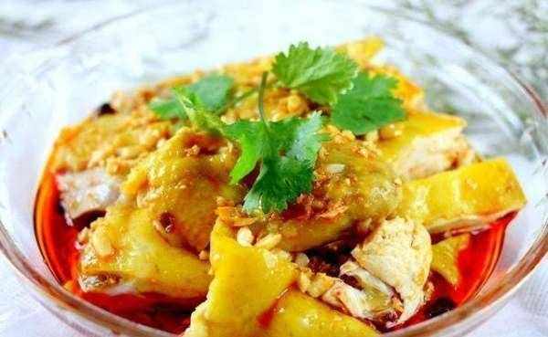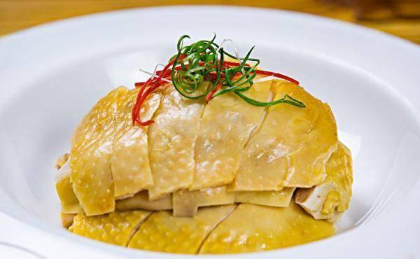 炒锅中火加热,加入花生油略煮取出克倒入姜葱精盐小酱中剩下克备用。将鸡宰杀后放入微沸的水锅中浸泡分钟左右,然后挂起来晾干外皮,立即将煮熟的花生油扫在外皮上切成小块放入盘中打造成鸡的形状。配以姜酱和葱丝。工艺关键泡鸡时水面要抬高两次即每分钟一次。