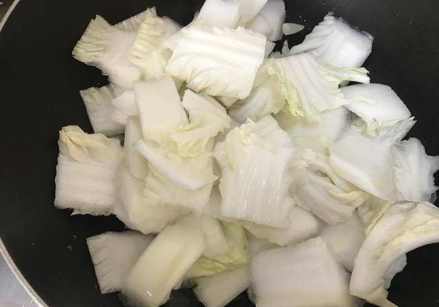 7、一直到有香味出来了以后,就把白菜帮倒入在锅里用大火进行翻炒。