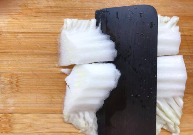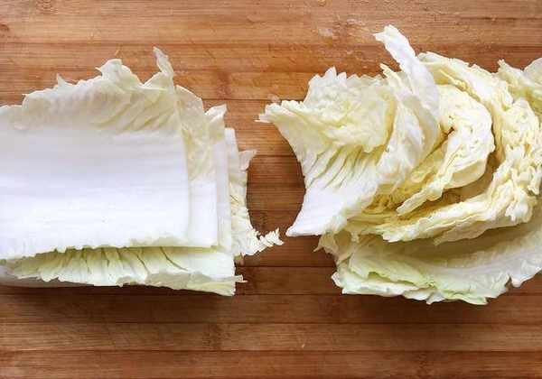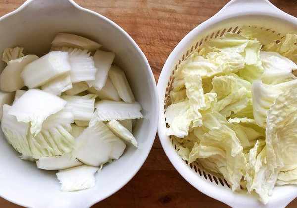 3、白菜帮需要先把它给压平了,然后再把它中间切一下,然后斜着再切一刀,白菜叶用手撕开。