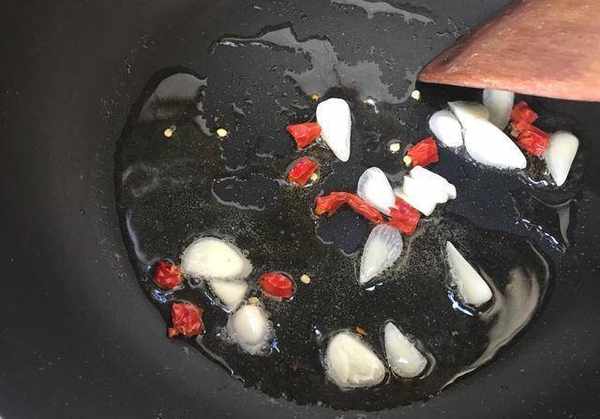 6、先把锅加热了,然后在里面倒入油,并且加入蒜和干辣椒进行爆香。