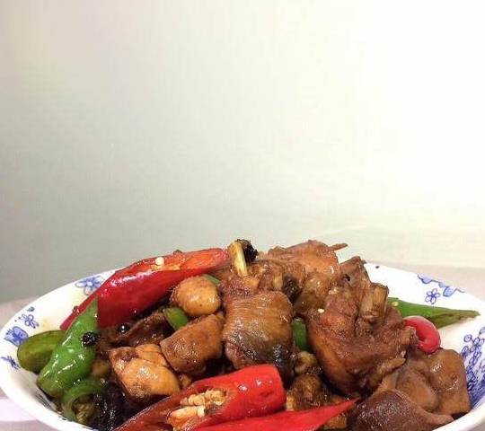 用料:整鸡半只、青红辣椒各一把、八角花椒各适量、葱姜适量、香菇两个、生抽适量、老抽适量、大蒜适量、糖少许、盐适量;
