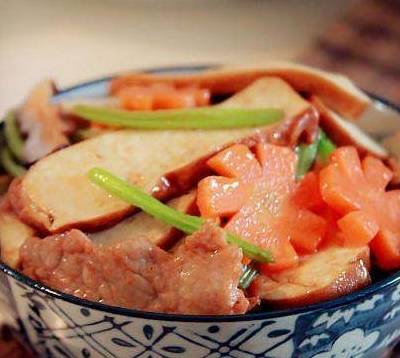 3.加生抽、盐、一些白糖调味,倒少许清水加盖焖煮一会儿;加清水煮一会儿是为了香干入味,同时胡萝片也能煮烂;最后倒入炒好的肉片,大火翻炒收汁,即可!