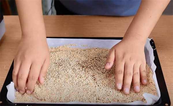 5.把刚才炒好的芝麻铺上去,再倒上面团让其均匀地裹上白芝麻,等20分钟冷却。