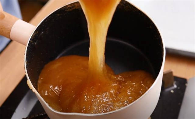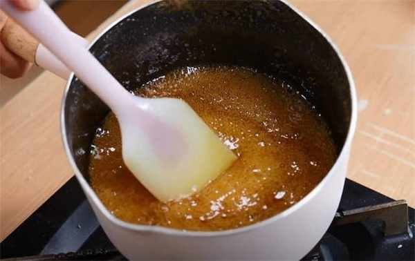 3.再准备一口小奶锅,100g白糖,麦芽糖放上200g,再添加300g的清水,煮开之后转小火,转小火熬了大概有20分钟,一直到这种非常粘稠的状态就可以了。