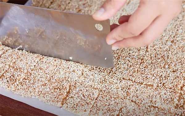 6.现在这个牛皮糖已经放凉了,我们切一下。