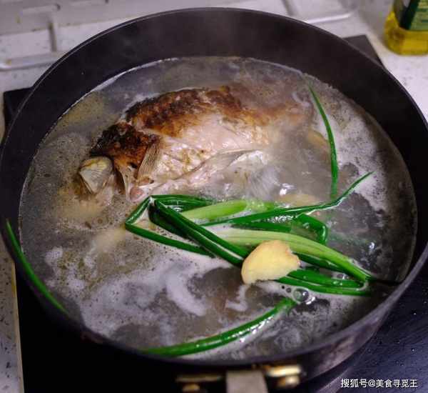 4、这个时候先把鲫鱼拨到锅边,然后把备好的葱姜蒜倒进去,煸炒出香味,然后再直接倒入滚烫的开水,大火煮10分钟,这个时候汤很容易就变得非常白了。