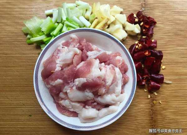 2、准备少许的肥瘦相间的五花肉,稍微冷冻一下,这样切的时候就比较容易一些,切成薄厚均匀的厚片;然后再准备少许蒜片、姜片和干辣椒段备用;