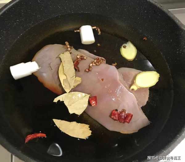 2、泡好的猪肝直接冷水下锅,然后放少许的生抽、老抽、料酒、食盐,再放入提前备好的料包(花椒、八角、香叶、桂皮、干辣椒),姜片,中小火烧开后,煮15-20分钟左右,用筷子插一下,没有血水就说明熟了。