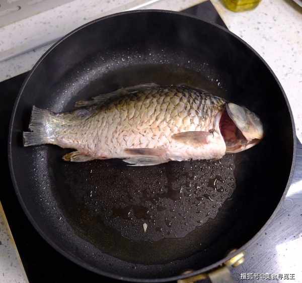3、鲫鱼处理干净之后,放在通风处晾干表面的水分。然后锅中倒油,油温烧至6成热的时候,放入鲫鱼,中小火煎至两面金黄。