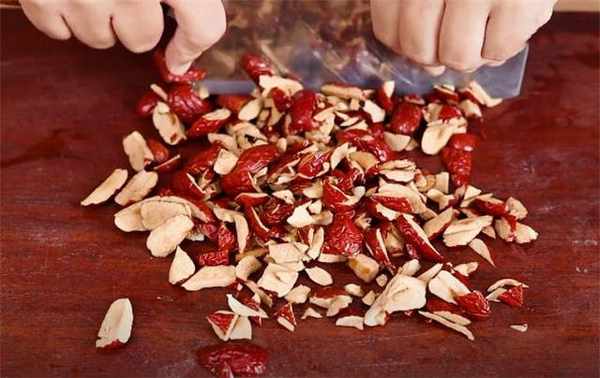 2.时间差不多到了,现在我们来处理一下红枣,把红枣去核切碎。