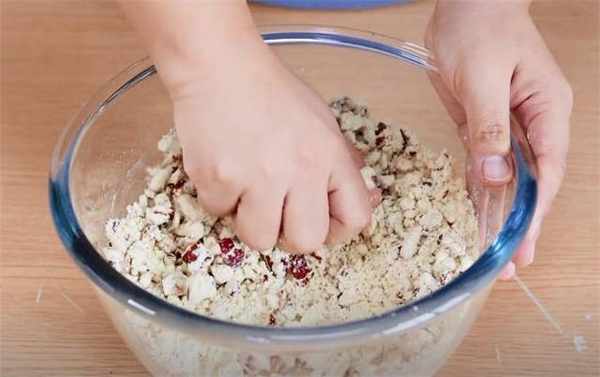 3.这时候再准备一些大黄米面,把切好的红枣碎放进去,和面的时候我们只用清水就可以了,少量多次的添加,搅拌到颗粒的状态就可以下手揉面了,这个面团要和的稍微硬一点。