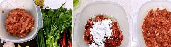 牛肉500克、蛋清适量、白菜适量、香菜适量、大蒜5瓣、姜一块、葱一把、辣椒适量、鸡精适量、食盐少许、蚝油2勺、米酒50毫升、淀粉10g、水适量、五香粉少许