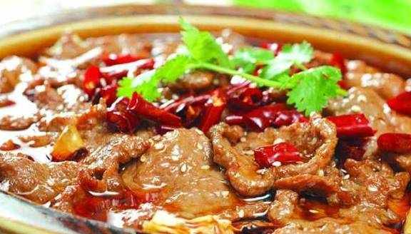 水煮牛肉麻辣味厚,滑嫩适口,香味浓烈,具有川味火锅麻、辣、烫的风味。此菜白、红、绿、黄四色相映,色彩朴素清新,牛肉肥嫩异常、味道酸辣鲜香。水煮牛肉中的牛肉片,不是用油炒熟的,而是在辣味汤中烫熟的,故名水煮牛肉。
