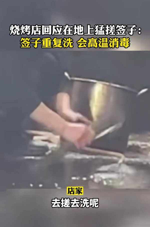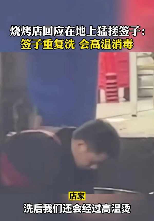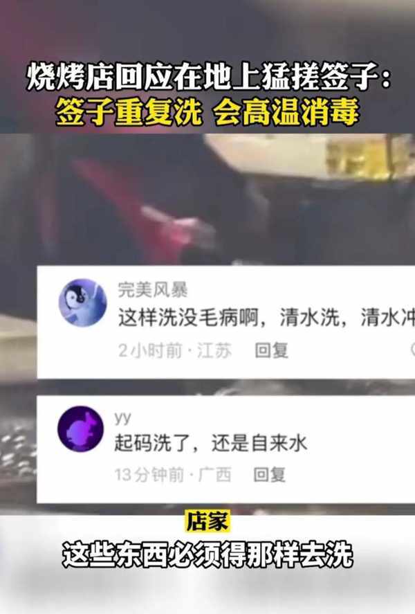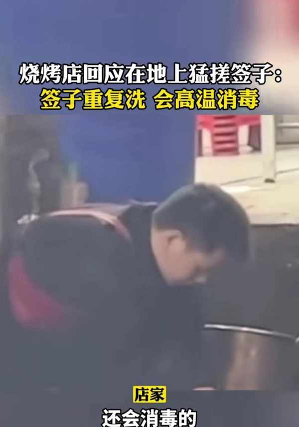有从事烤肉行业的人士就出来解释了,烤肉用的铁签子是反复利用的。由于使用过程中容易残留一些烤肉残渣,很难清洗,所以才会放在地上搓洗。而且一般都会过清水,然后高温消毒才会继续使用,是干净卫生的。