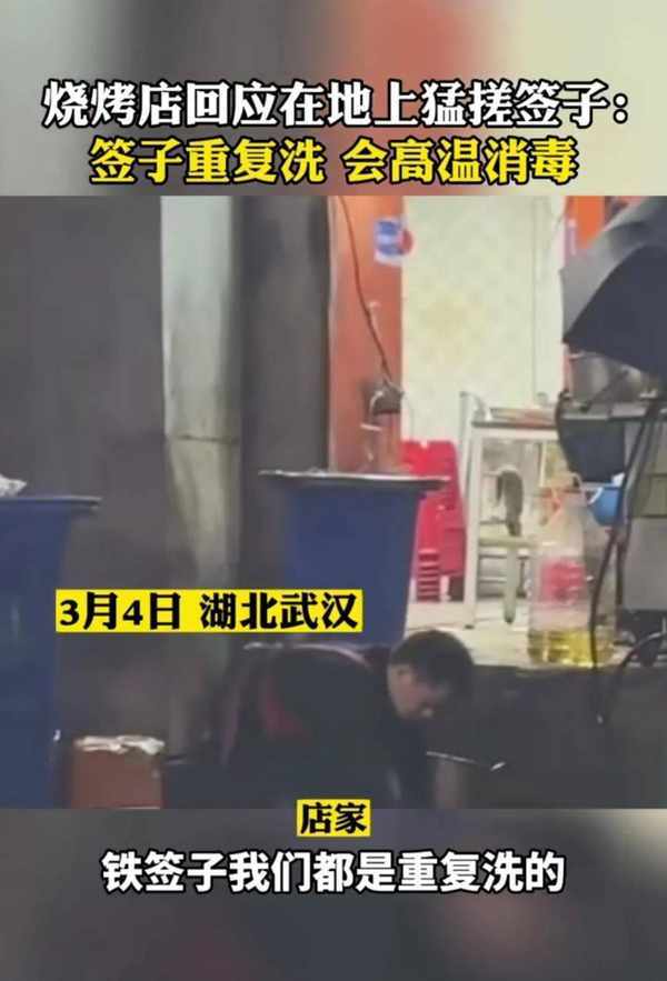 最近有人曝光了湖北武汉一家烧烤店把烧烤签子放在地上搓洗的视频,还质疑这样的烤肉店干净卫生吗?