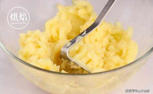 ②将蒸好的土豆放入干净的容器中,用压泥机压碎,尽量压得均匀细腻。