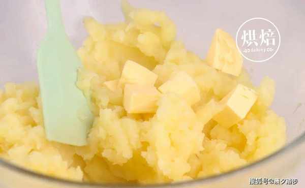 ③将室温软化的黄油加入土豆泥中,利用土豆泥的余温不断搅拌,使黄油完全融入土豆泥中。