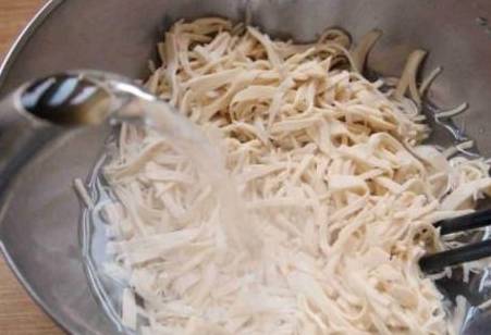 在片开、切丝后,先用开水烫三遍,主要是把干丝烫软,然后把干丝放进盘子里,干丝上放一撮姜丝,再用开水从上往下一烫,让姜汁进入干丝内,滗去水后,干丝内留有一定姜汁,放入开水泡过的虾米、绿笋末、香菜等配料,再淋上麻油和酱油调味即可。