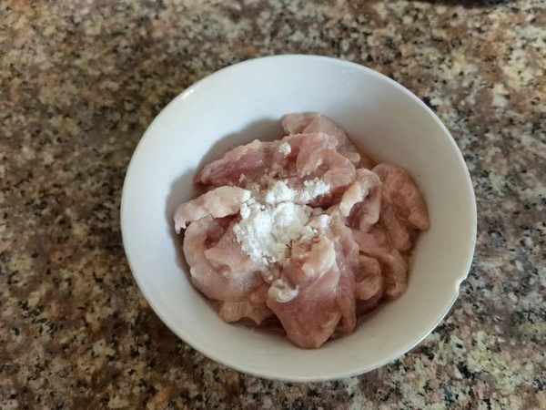 2、一些猪肉切成片状,先放一点生抽, 姜粉,食用油拌匀,接着调入一点生粉,搅拌至上浆。