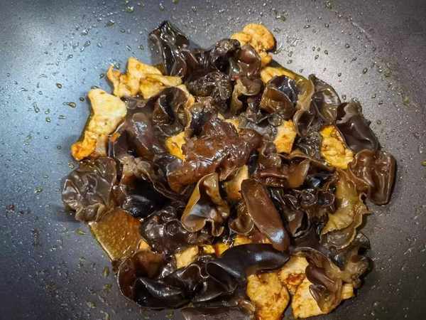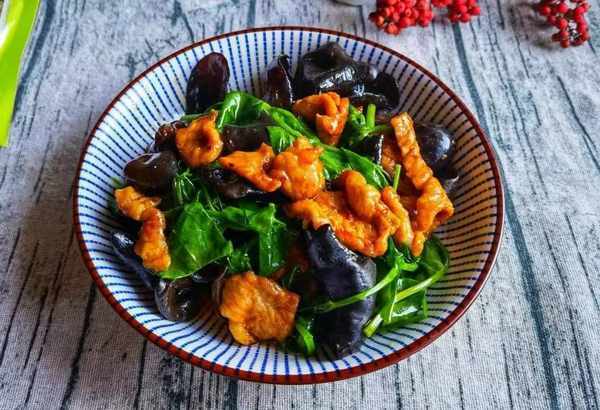 3、起锅烧油,油热透之后,把肉片先放进去炒至断生。接着把木耳倒进去,调入酱油,蚝油各少许,大火快炒一分钟。
