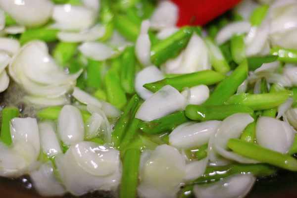 4、起锅烧油,放入葱花增香,接着把芦笋百合一起下锅,调入一点鸡精,盐,然后大火快炒,待芦笋断生,百合看起来微微透亮,就可以关火出锅了。