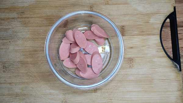 2、鸡蛋两个先在碗中搅散。再准备一根火腿肠,切成斜刀的小片。