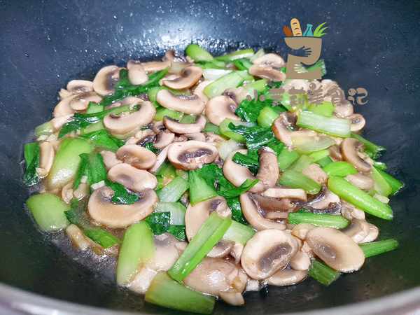 4、接着我们把油菜倒进锅里,与口蘑一起快速翻炒,最后调入少许盐,继续炒几下,淋入一点水淀粉将汤汁收浓稠,即可关火装盘。